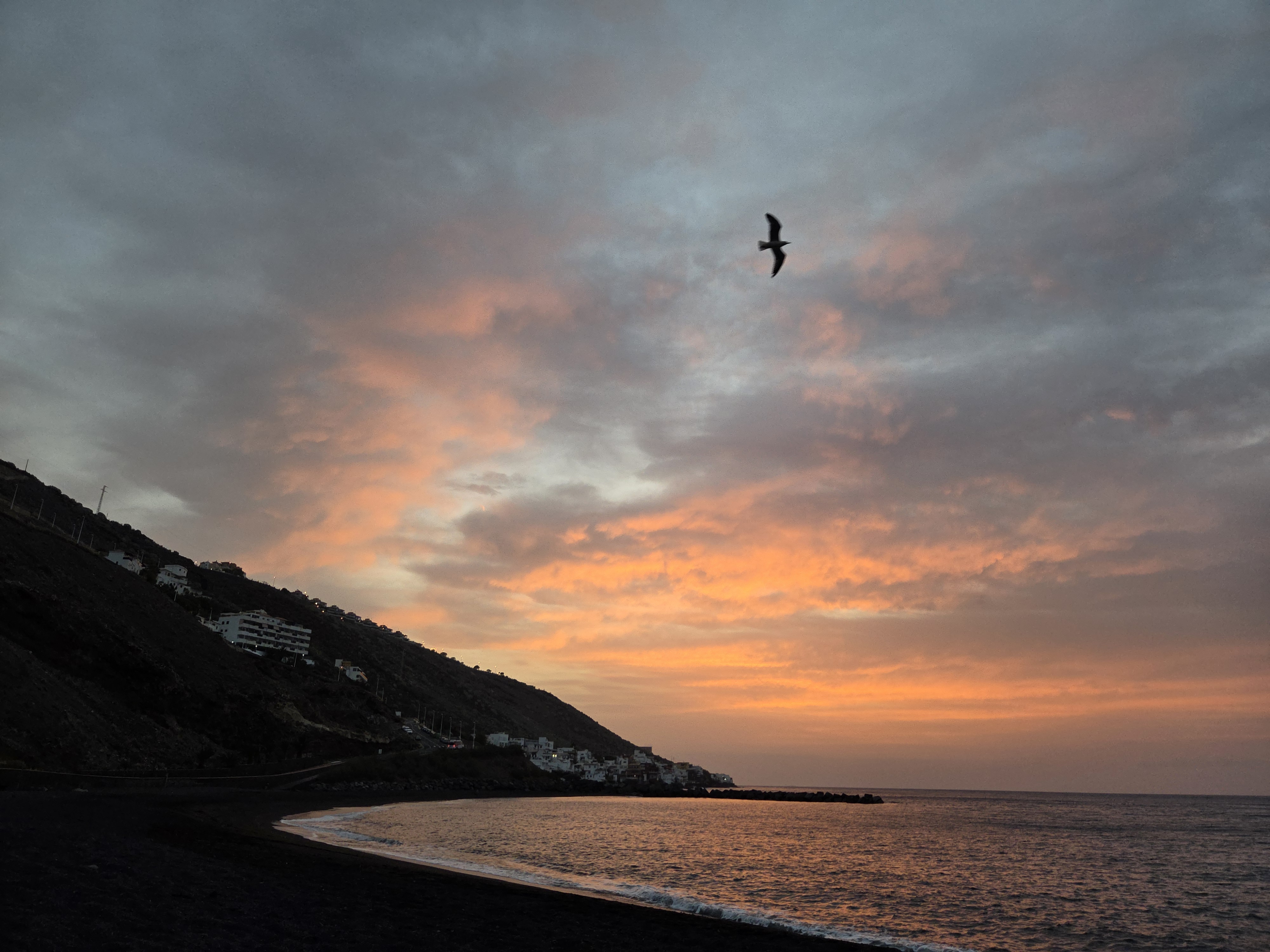 Esta playa de arena negra es un lugar tranquilo desde donde se puede observar cómo el sol se oculta en el horizonte, ofreciendo vistas panorámicas del océano Atlántico.