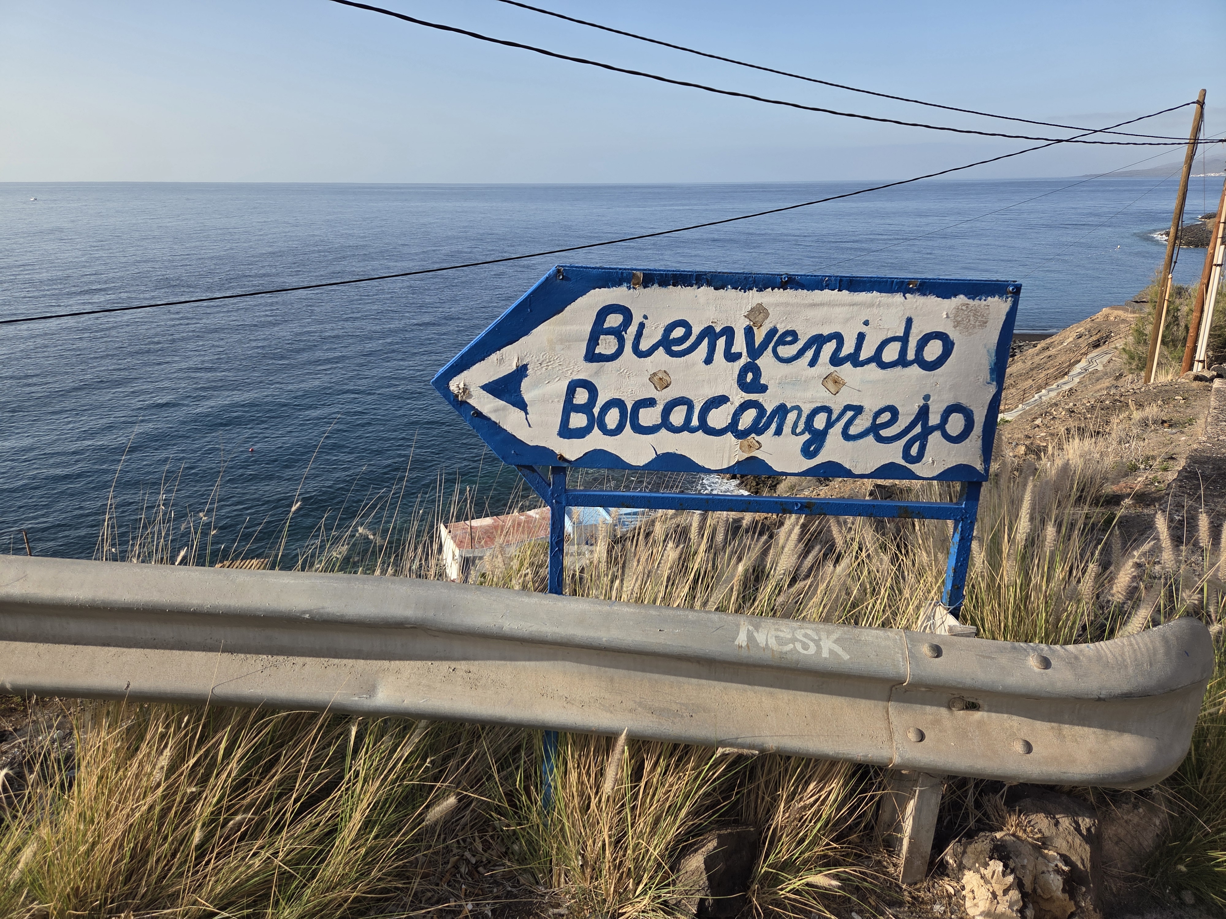 Una flecha pintada a mano con el mensaje “Bienvenido a Bocacangrejo” es la primera señal de que este lugar no es como los demás. La carretera desciende de forma serpenteante hasta encontrarse con el mar. Desde lo alto, se puede ver el Atlántico en calma, y las casas que parecen sostenerse sobre la roca volcánica.