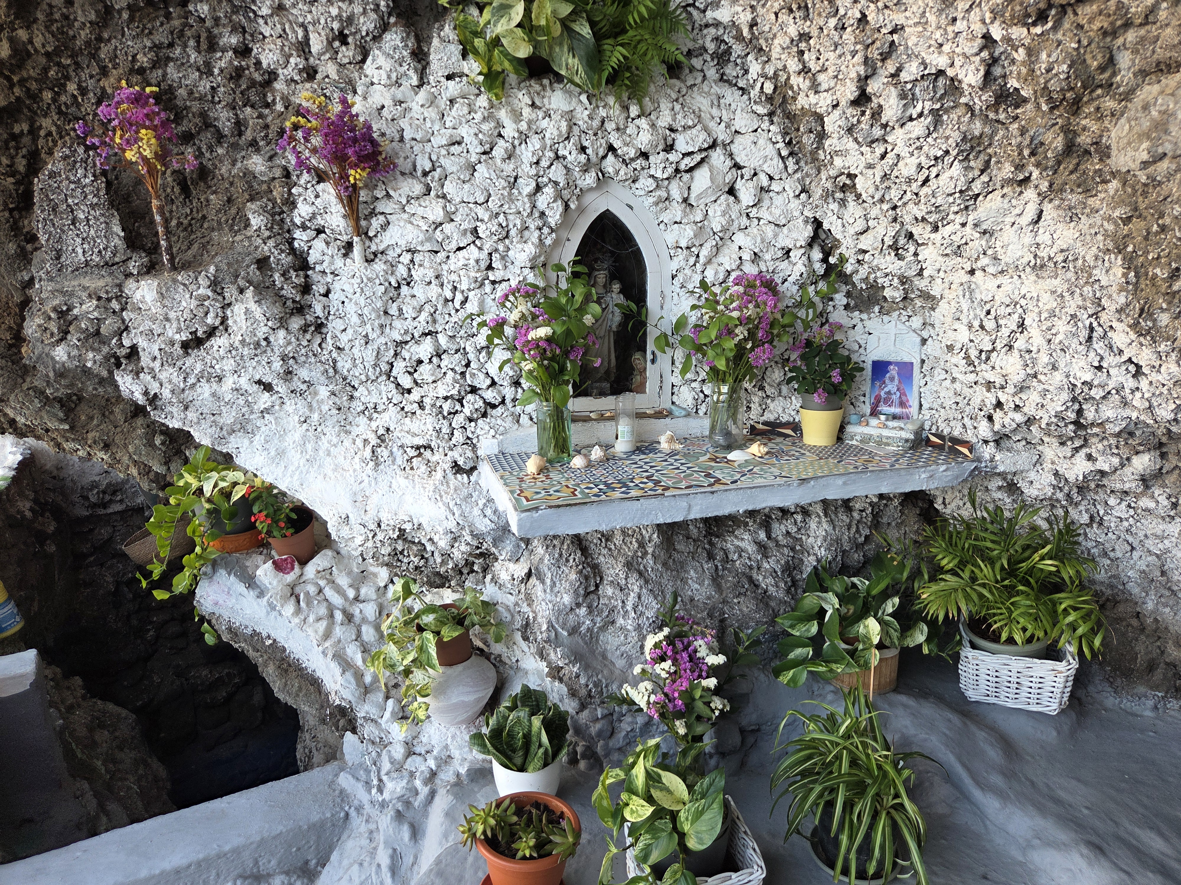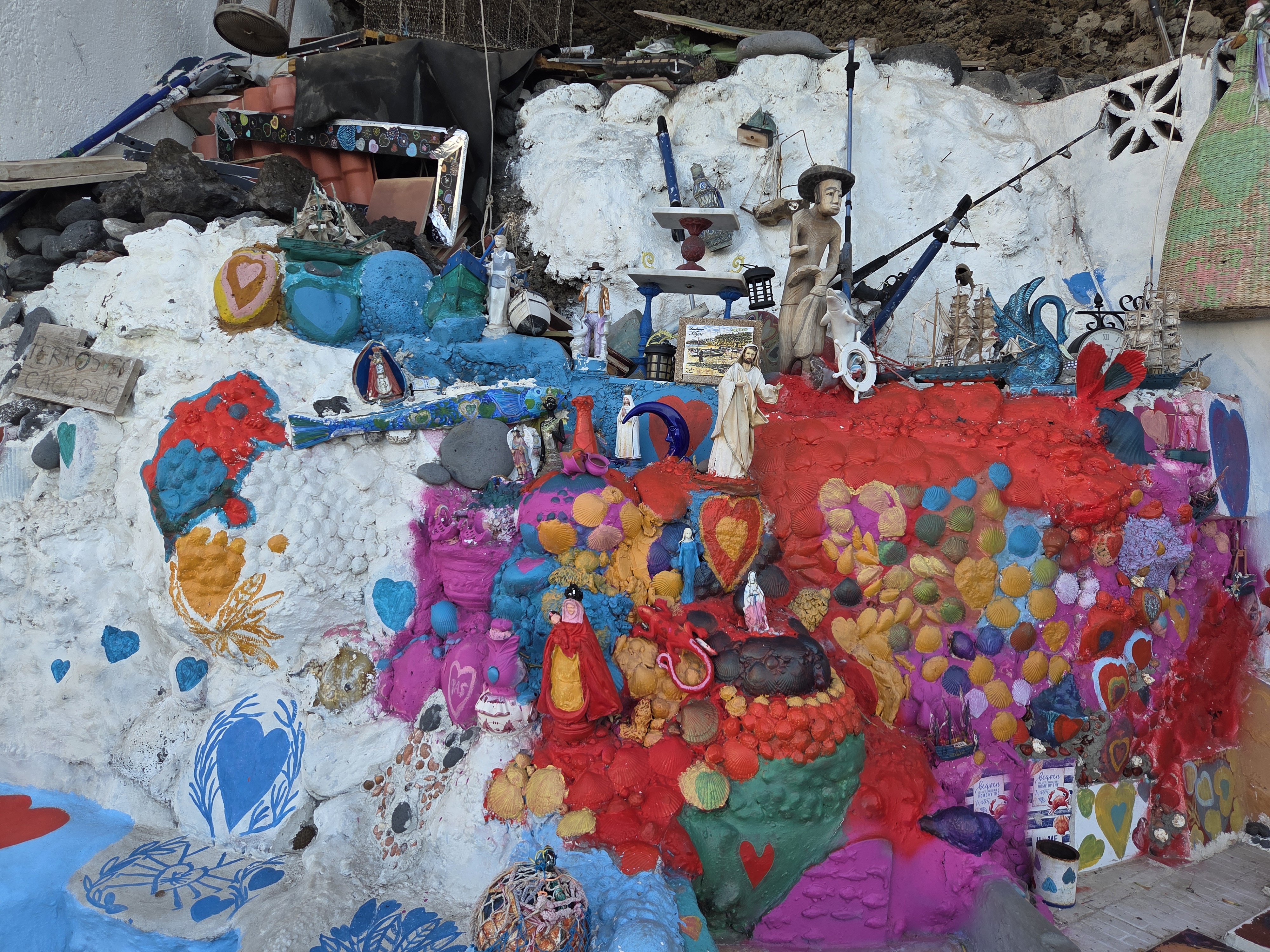 No es raro encontrar cañas de pescar colgadas en las paredes junto a herramientas viejas y mensajes como “Esto mata”, que invitan a la reflexión sobre el consumo o el mar. En otras zonas, flores, caracolas, corazones de colores y figuras religiosas decoran las piedras. Todo parece decir: “Aquí la vida se vive a nuestro modo”.